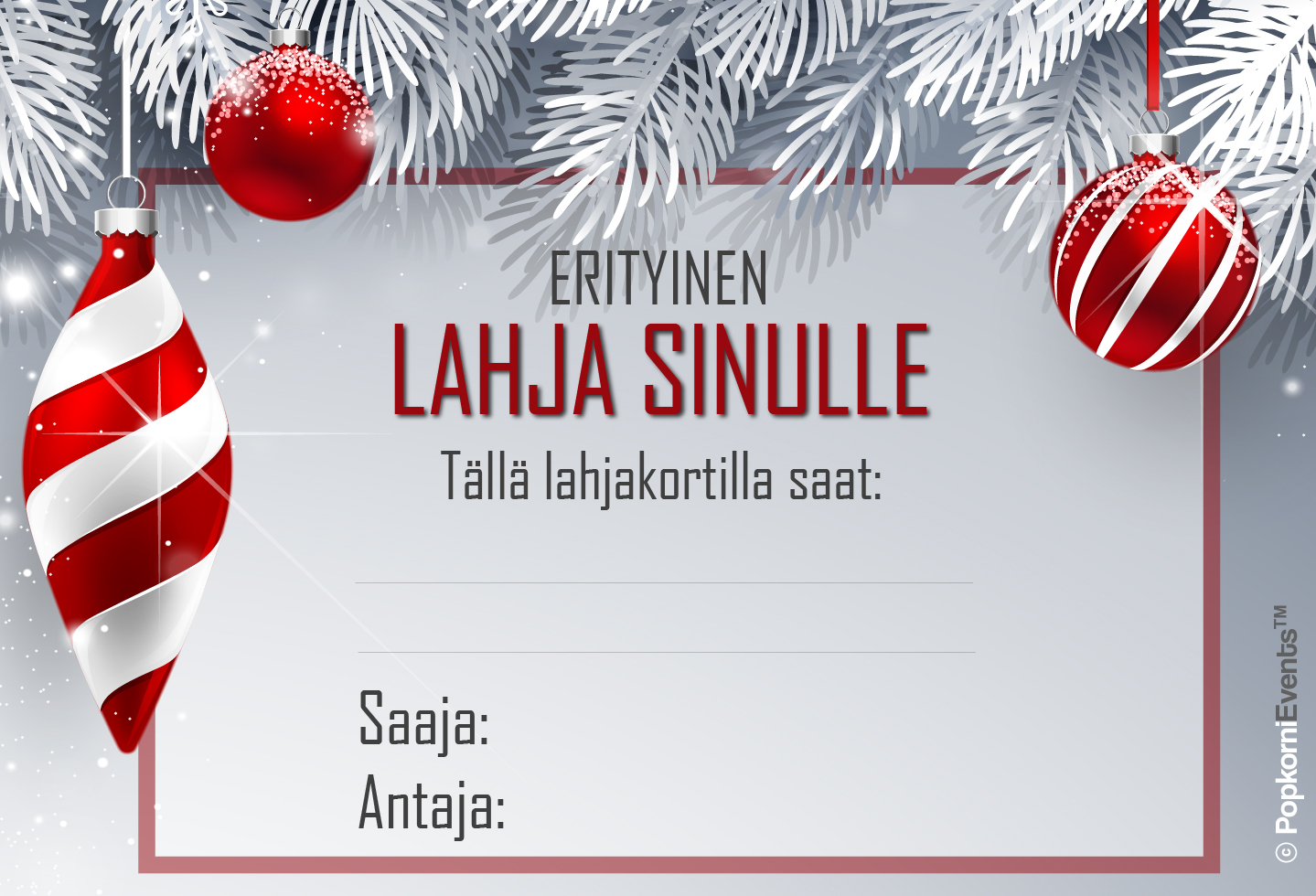 Mikä olisi parempi lahja kuin antaa joululahjaksi mukava teko tai lupaus, jonka lahjakortin saaja voi lunastaa haluamanaan ajankohtana! Ideoita lahjakorttiin voisi olla vanhemmille vaikka aamupala sänkyyn, lupaus ikkunoiden pesusta keväällä tai kynttiläillallisen valmistus perheen nuorison voimin. Lataa tästä lahjakorttipohja ja anna lahjakortti lapsille, vanhemmille, sukulaisille tai vaikkapa naapurille! Voit kirjoittaa tekstit käsin tai täyttää tyhjät kentät avaamalla tiedoston Acobat Readerilla tai Chromella.